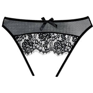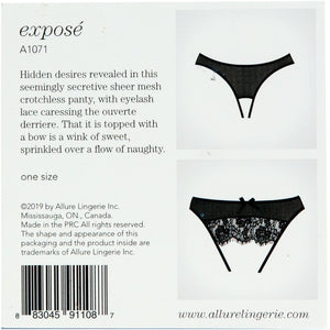 The seductively sheer mesh crotchless panty from Adore by Allure Lingerie is a showstopper. Eyelash lace caressing the backside of the panty, and is complete with a sexy little bow.