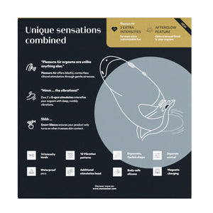 The vibrations and air pulsations are controlled separately and easily via soft-touch buttons on the top of the stimulator head. With the Smart Silent mode, the DUO 2 will only turn on when in direct contact with your skin, keeping the already quiet rumbles even quieter. With the Afterglow feature, press the power button briefly after climax, bringing the intensity of the DUO 2 down to level 3 for a relaxing finish.